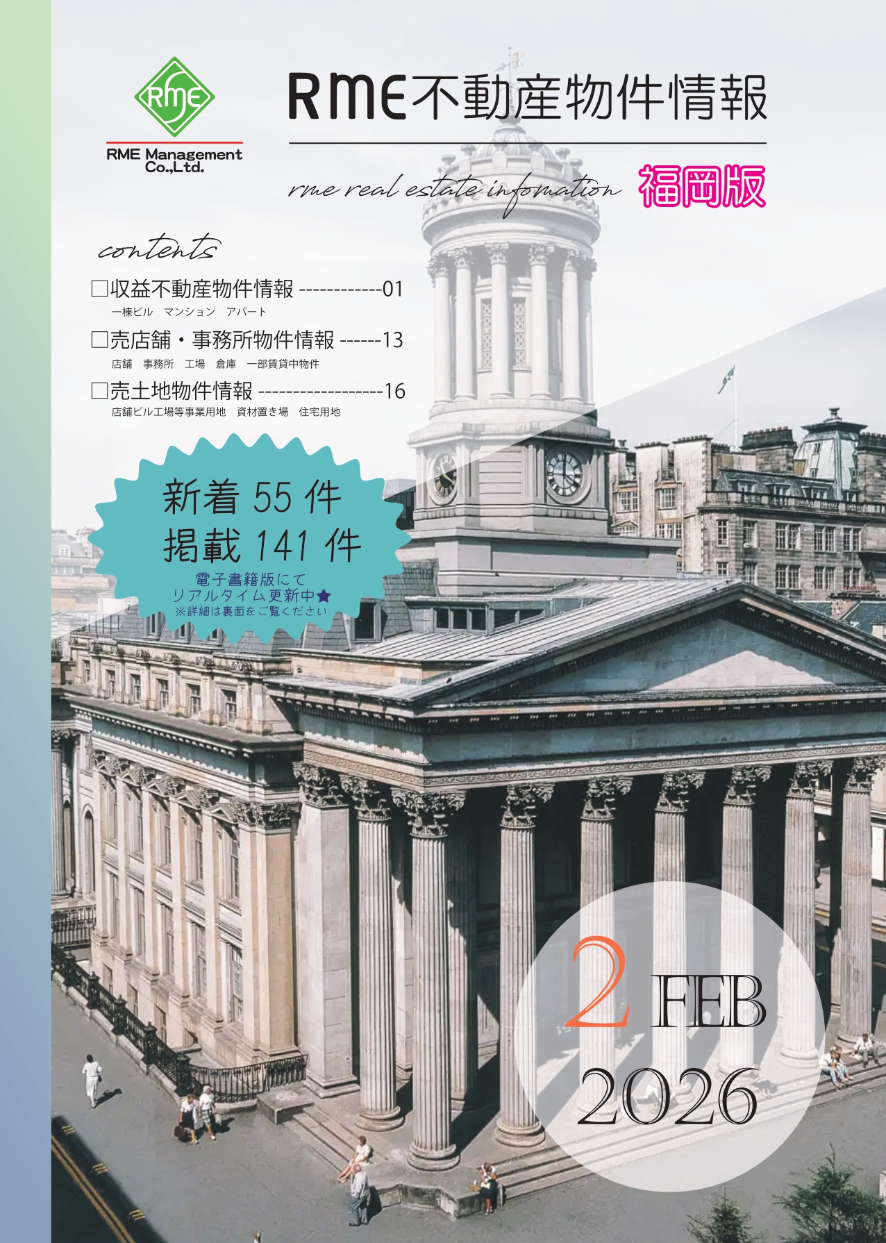 ・収益 ・・・1~12ページ (掲載数 68件 内新着 33件) ・売店舗・事務所・・・13~15ページ (掲載数 16件 内新着 5件) ・売地 ・・・16~25ページ (掲載数 57件 内新着 17件)